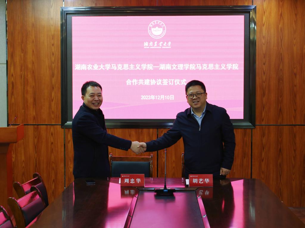 为深入贯彻落实习近平总书记关于加强马克思主义学院建设和思政课教学的系列重要指示批示精神,对标对表中宣部、教育部等部门的相关政策要求和工作部署,推动马克思主义学院协同发展,深化院际之间交流合作,12月10日下午,我院与湖南农业大学马克思主义学院签署共建合作协议。
