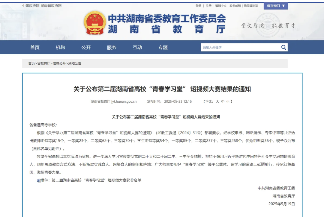 近日,由湖南省委教育工委、湖南省教育厅、湖南日报社联合主办的第二届湖南省高校“青春学习堂”短视频大赛圆满落幕。本次吸引了全省120余所本专科高校的积极参与,共收到2200余件参赛作品。经过激烈角逐,我院学生凭借扎实的创作功底与深刻的思想内涵脱颖而出,斩获2项省级一等奖、2项省级二等奖、5项省级三等奖。