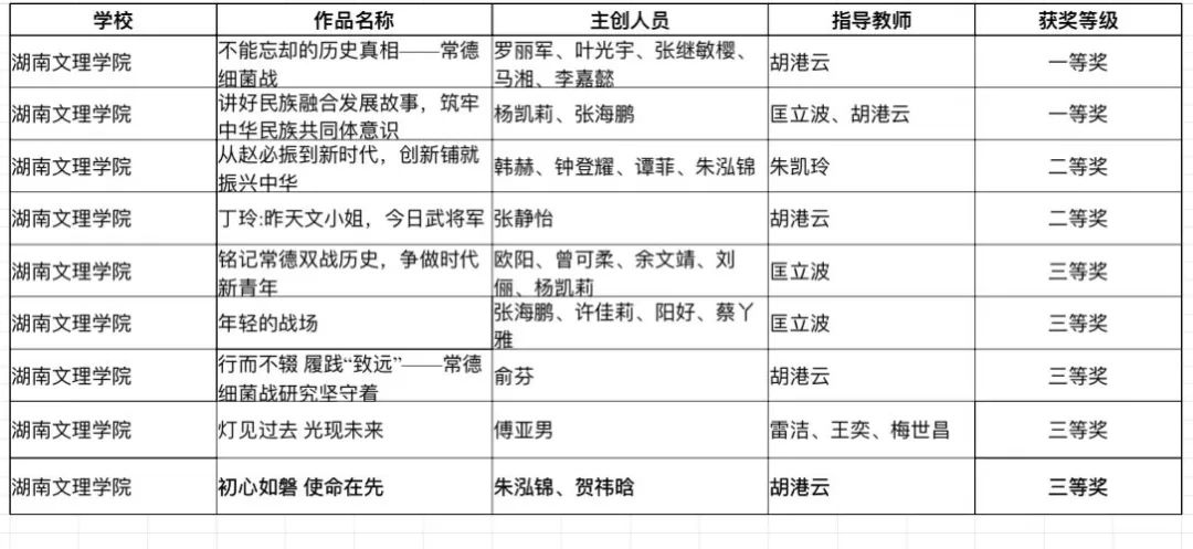 在获奖作品中,一等奖作品《不能忘却的历史真相——常德细菌战》《讲好民族融合发展故事,铸牢中华民族共同体意识》聚焦历史传承与民族发展,以深刻的主题挖掘、生动的内容呈现,传递红色基因与时代价值;二等奖作品《从赵必振到新时代,创新铺就振兴中华路》《丁玲:昨天文小姐,今日武将军》立足本土文化与名人精神,讲好时代故事;三等奖作品《铭记常德双城历史 争做时代新青年》《年轻的战场》《行而不辍 履践“致远”——常德细菌战研究坚守者》《灯见过去 光现未来》《初心如磐 使命在肩》也以独特视角展现青春担当,引发广泛共鸣。这些荣誉的取得,离不开主创学生的深耕细作,也得益于指导教师的专业引领。