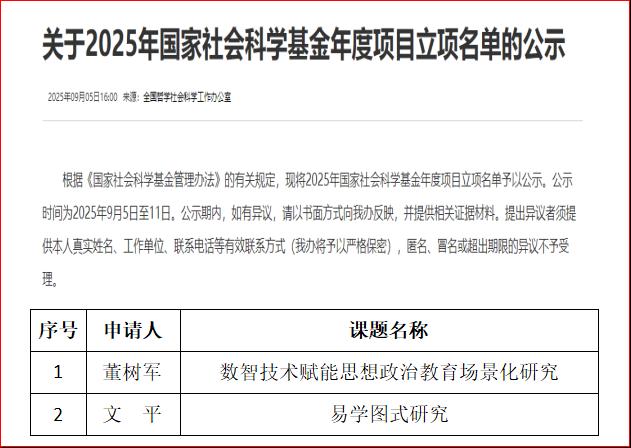 9月5日,全国哲学社会科学工作办公室公示了2025年度国家社科基金年度项目立项名单,我院2项课题喜获立项,分别是董树军教授的《数智技术赋能思想政治教育场景化研究》和文平教授的《易学图式研究》。