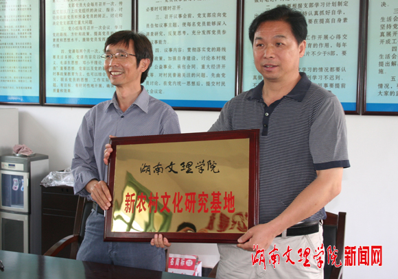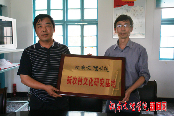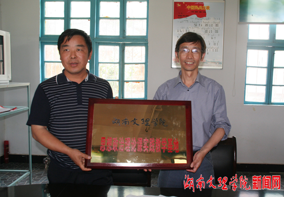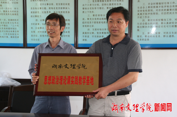 | 本网讯(记者 沽月 摄影 沽月)5月13日上午,鼎城区灌溪镇富贵坪村、石板滩镇毛栗岗村的两位村支书从我校思想政治理论课部主任卢秉利手中接过“思想政治理论课实践教学基地”和“新农村文化研究基地”两块牌匾,高兴的说:“真是太感谢你们了,这对于丰富我们村民的业余文化生活,提升我们的文化品位太有意义了!”