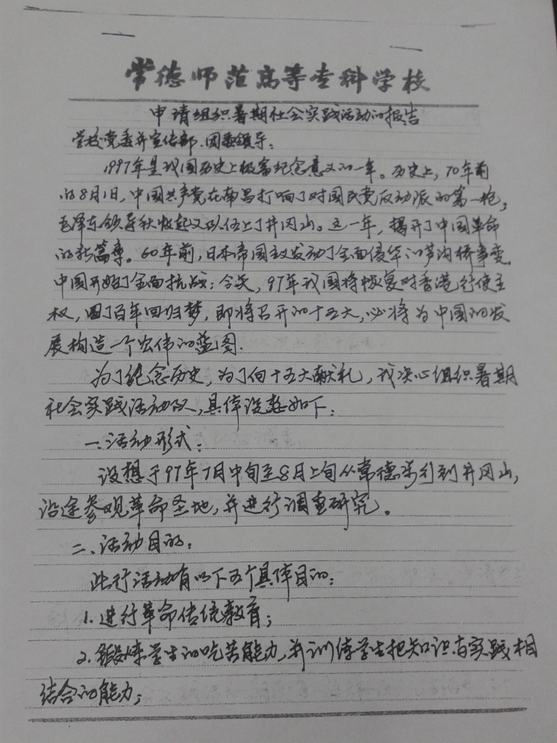 1997年暑期社会实践活动的报告(党团)