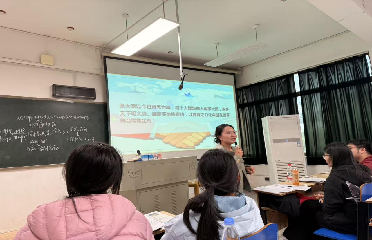 课堂还展示了中国负责任大国形象:在坚定维护自身利益的同时,积极兼顾他国合理关切,通过“一带一路”倡议、中非合作论坛等平台推动合作共赢,致力于构建人类命运共同体。为增强学生政治认同与表达能力,彭秀枝组织课堂模拟活动:学生分组扮演“商务部新闻发言人”,针对美国出口管制中的“穿透性规则”进行讨论并模拟回应,在情境中锻炼立场表达与政策理解能力。最后,教师进行总结与价值引导,强调新时代青年应将个人理想融入国家发展大局,坚定“四个自信”、增强国家认同与责任意识,以实际行动支持祖国在国际舞台发挥更积极作用。