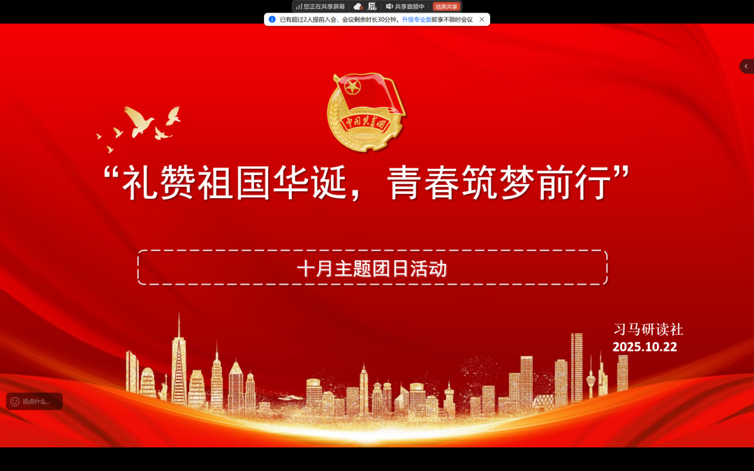 本网讯(记者 吴美嫣)为礼赞祖国华诞,凝聚青春力量,2025年10月22日,习马研读社以线上形式开展“礼赞祖国华诞,青春筑梦前行”主题团日活动。此次活动由社团团支书郝源主讲,全体成员参与。