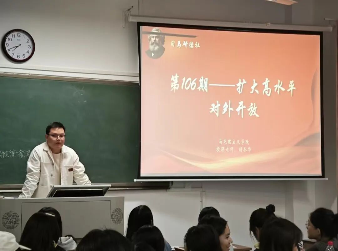 本网讯(记者 吴美嫣)深入解读 “扩大高水平对外开放” 的核心要义与实践路径,2025年11月30日,“习马研读社”在东校区第一教学楼A501举办“扩大高水平对外开放”主题讲座。此次活动由马克思主义学院胡冬华老师主讲,“习马研读社”全体成员参与。
