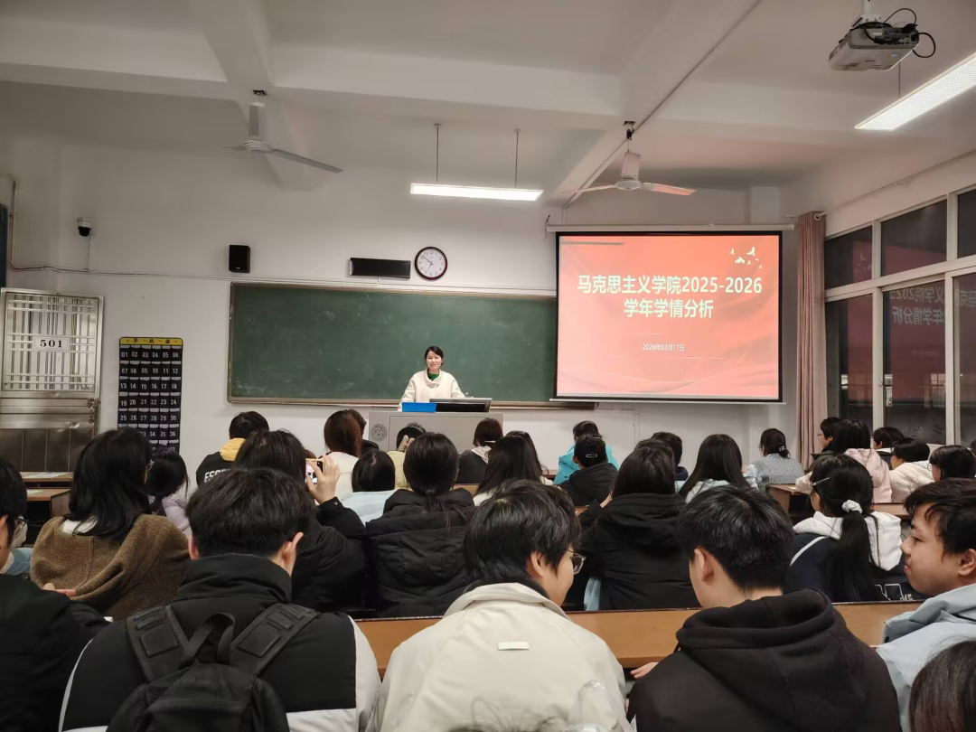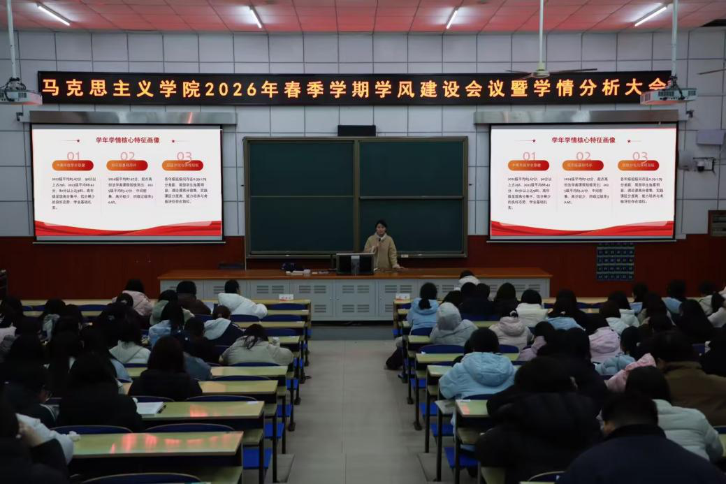 为加强学院学风建设,进一步优化育人环境,马克思主义学院召开2026年春季学期学风建设会议暨学情分析大会,本次会议于两个校区开展,西校区会场于3月17日在第三教学楼D301举行,东校区会场于3月19日在第一教学楼A501举行。马克思主义学院党委副书记胡港云、学工办主任石星、兼职辅导员肖诗晓、2022级在校学生、2023至2025级全体同学共计260余人参加会议。