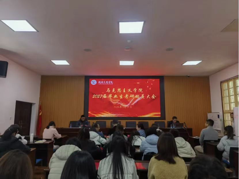 为助力2027届毕业生认清考研形势,科学备战考研,马克思主义学院于2026年3月11日在红楼二楼会议室召开2027届毕业生考研动员大会。参与会议的有马克思主义学院院长董树军、学工办主任石星、就业专干肖诗晓、老师代表以及23级学生代表。本次会议由马克思主义学院党委副书记胡港云主讲。