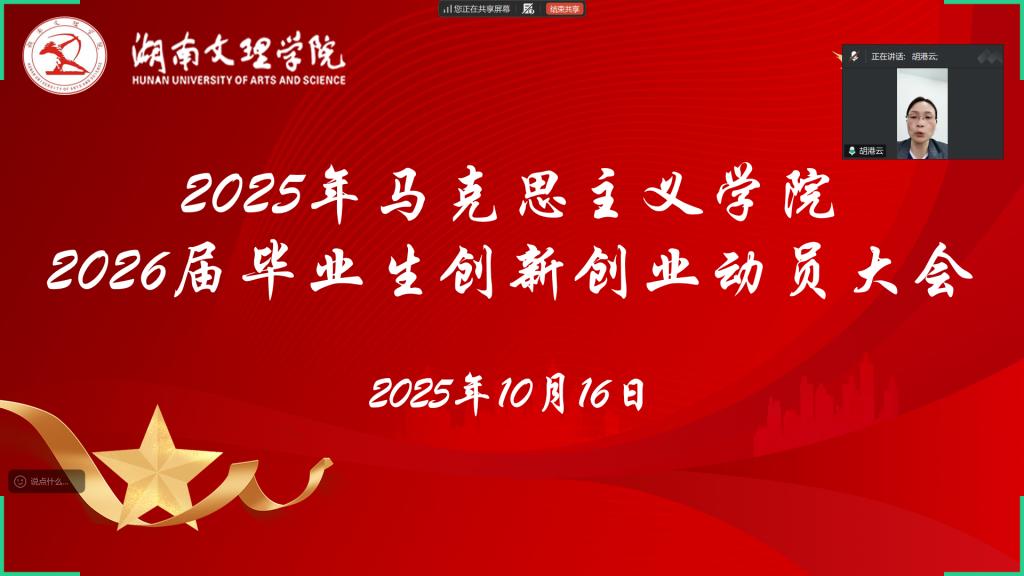 为有效推进2026届毕业生创新创业工作,帮助学生明确发展方向、破解发展难题,马克思主义学院于2025年10月16日组织召开2026届毕业生创新创业动员大会线上会议。参加本次线上会议的有党委副书记胡港云书记、就业专干王奕老师、思政22102班全体同学。